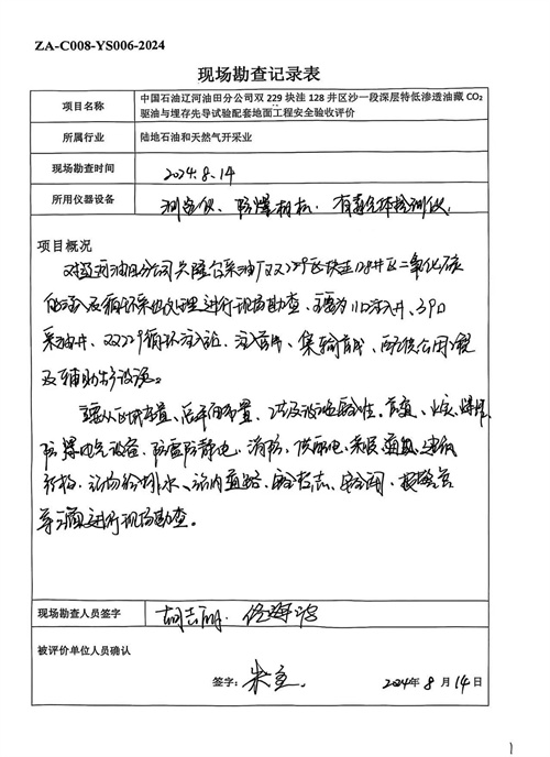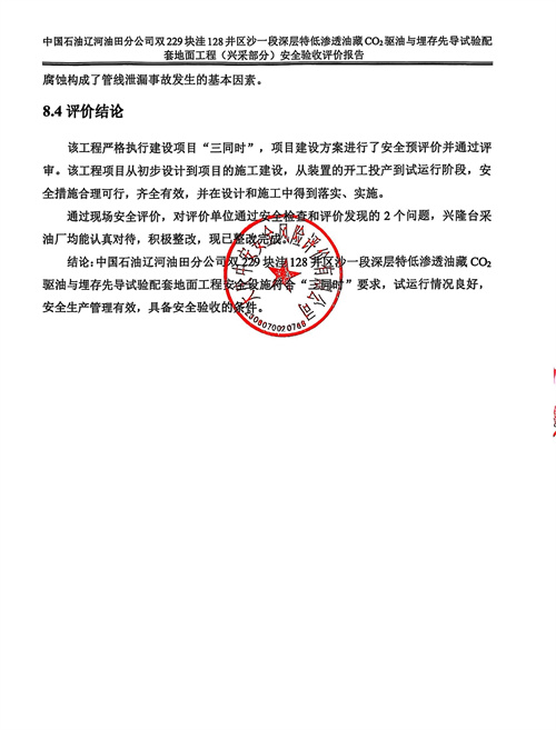 結論:中國石油遼河油田分公司雙229塊洼128井區沙一段深層特低滲透油藏CO2驅油與埋存先導試驗配套地面工程安全設施符合“三同時”要求,試運行情況良好,安全生產管理有效,具備安全驗收的條件。