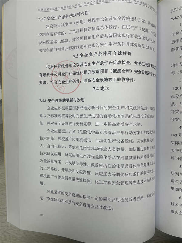 常熟三愛富氟化工有限責任公司全廠存儲優化提升改造項目(液氯倉庫)安全設施符合設計要求,具備安全設施竣工驗收條件。