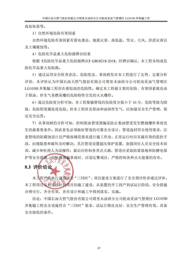 中國石油天然氣股份有限公司塔里木油田分公司輪南采油氣管理區LG103H井集輸工程安全驗收評價 |