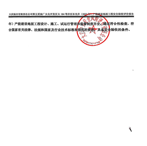 大慶油田有限責任公司第五采油廠太北開發區太184等井區補充井(2022年)產能建設地面工程設計、施工、試運行管理和監督制度齊全,通過符合性檢查,符合國家有關法律、法規和國家及行業技術標準和規范的要求,具備安全驗收的條件。 |