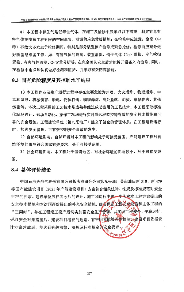 中國石油天然氣股份有限公司長慶油田分公司第九采油廠吳起油田新310、新479等區產能建設項目(2025年產能建設項目)方案符合相關法律、法規及標準規范對安全生產的要求。建設單位應在其今后的設計、施工和運行中進一步落實本工程方案提出的安全技術措施和本次預評價提出的補充安全措施,確實保證工程安全設施和主體工程的“三同時”,并在工程竣工投產后切實加強安全生產管理,以實現工程安全、平穩運行,采取安全對策措施后,建設項目潛在的危險、有害因素能夠得到控制。建設項目依據設計方案建成后,能達到有關法律、法規及標準規定的安全要求。