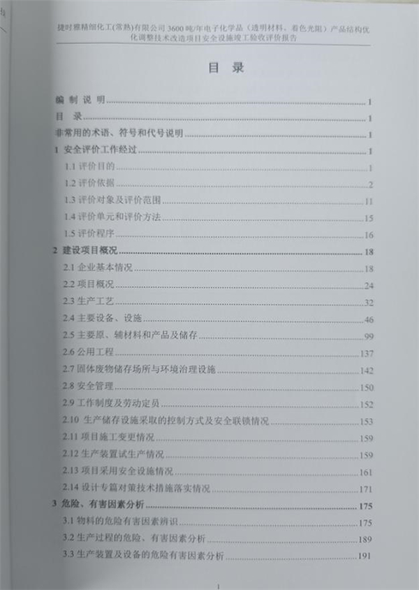 根據評價報告結論以及安全生產條件評價表檢查,捷時雅精細化工(常熟)有限公司3600噸/年電子化學品(透明材料、著色光阻)產品結構優化調整技術改造項目符合安全生產條件,具備安全設施竣工驗收條件。 |
