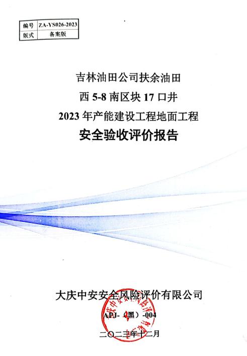 吉林油田公司扶余油田西5-8南區塊17口井2023年產能建設工程地面工程安全驗收評價報告 |