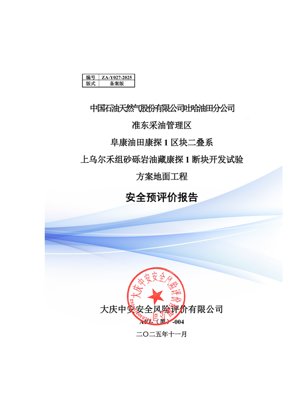 中國石油天然氣股份有限公司吐哈油田分公司準(zhǔn)東采油管理區(qū)阜康油田康探1區(qū)塊二疊系上烏爾禾組砂礫巖油藏康探1斷塊開發(fā)試驗方案地面工程安全預(yù)評價報告