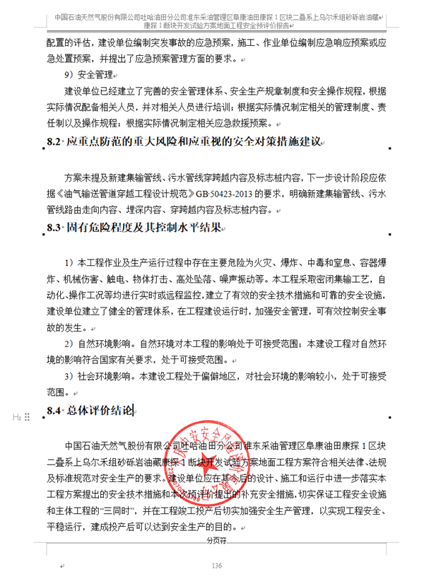 中國石油天然氣股份有限公司吐哈油田分公司準(zhǔn)東采油管理區(qū)阜康油田康探1區(qū)塊二疊系上烏爾禾組砂礫巖油藏康探1斷塊開發(fā)試驗方案地面工程方案符合相關(guān)法律、法規(guī)及標(biāo)準(zhǔn)規(guī)范對安全生產(chǎn)的要求。建設(shè)單位應(yīng)在其今后的設(shè)計、施工和運行中進一步落實本工程方案提出的安全技術(shù)措施和本次預(yù)評價提出的補充安全措施,切實保證工程安全設(shè)施和主體工程的“三同時”,并在工程竣工投產(chǎn)后切實加強安全生產(chǎn)管理,以實現(xiàn)工程安全、平穩(wěn)運行,建成投產(chǎn)后可以達到安全生產(chǎn)的目的。 |