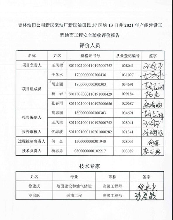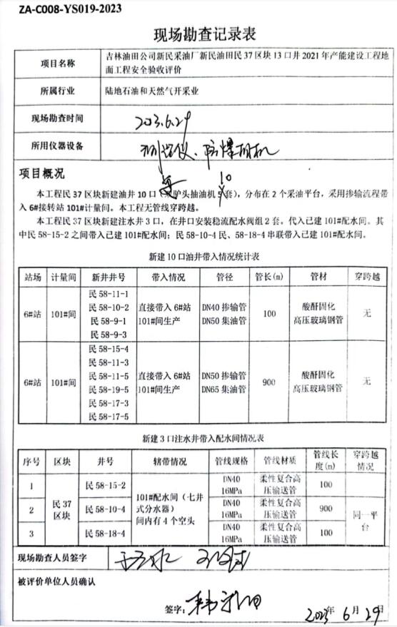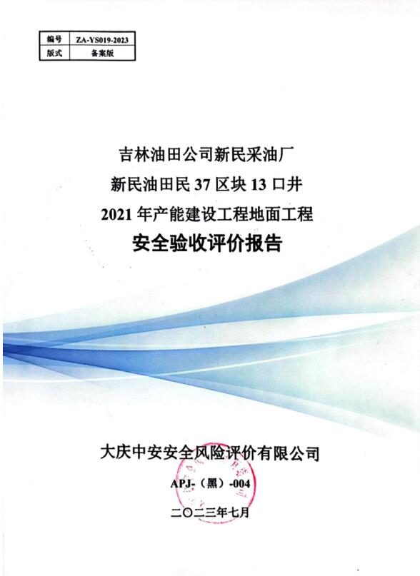 吉林油田公司新民采油廠新民油田民37區(qū)塊13口井2021年產(chǎn)能建設(shè)工程地面工程安全驗收評價