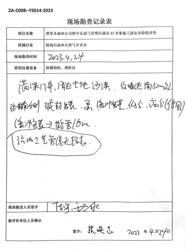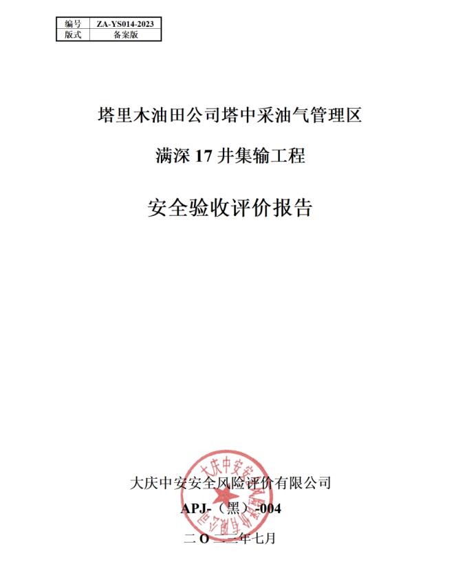 塔里木油田公司塔中采油氣管理區(qū)滿深17井集輸工程安全驗(yàn)收評價(jià) |