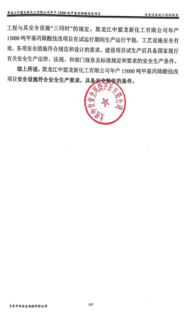 黑龍江中盟龍新化工有限公司年產15000噸甲基丙烯酸技改項目安全設施符合安全生產要求,具備安全驗收的條件。 |