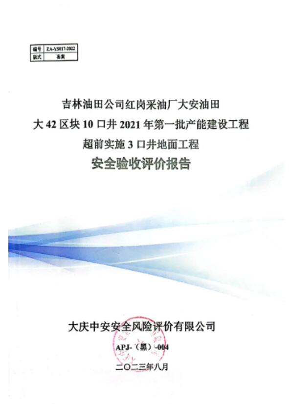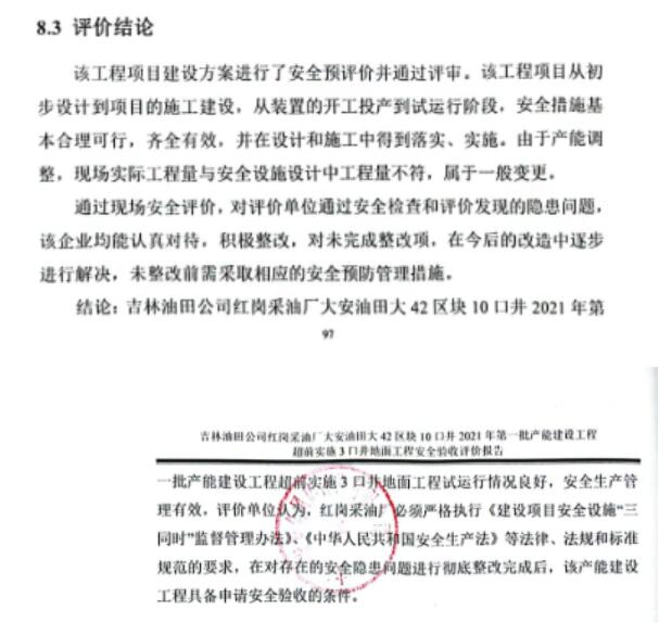 吉林油田公司紅崗采油廠大安油田大42區塊10口井2021年第一批產能建設工程超前實施3口井地面工程試運行情況良好,安全生產管理有效,評價單位認為,紅崗采油廠必須嚴格執行《建設項目安全設施“三同時”監督管理辦法》、《中華人民共和國安全生產法》等法律、法規和標準規范的要求,在對存在的安全隱患問題進行徹底整改完成后,該產能建設工程具備申請安全驗收的條件。 |