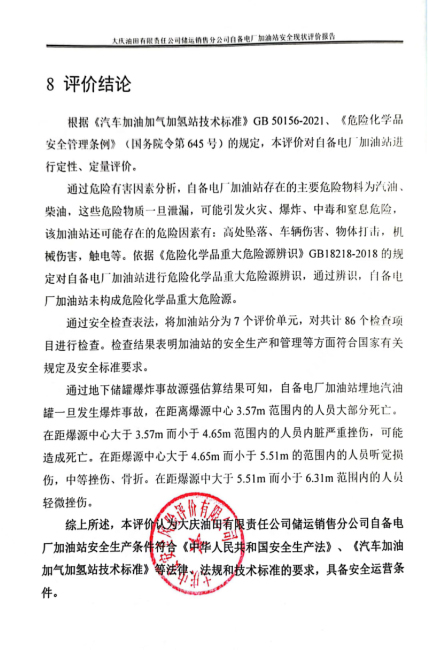 大慶油田有限責(zé)任公司儲(chǔ)運(yùn)銷售分公司自備電廠加油站安全生產(chǎn)條件符合《中華人民共和國安全生產(chǎn)法》、《汽車加油加氣加氫站技術(shù)標(biāo)準(zhǔn)》等法律、法規(guī)和技術(shù)標(biāo)準(zhǔn)的要求,具備安全運(yùn)營條件。 |