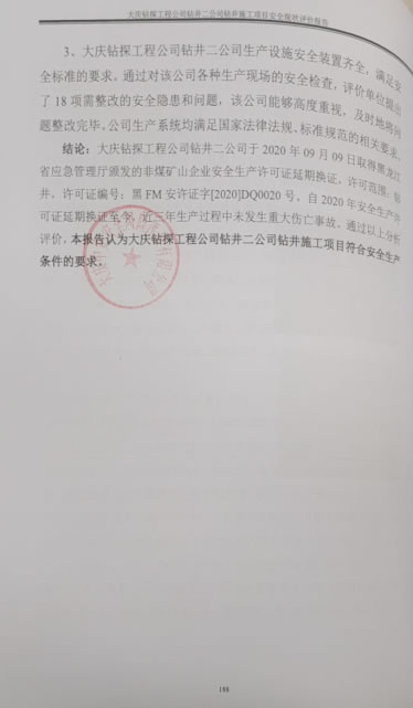大慶鉆探工程公司鉆井二公司于2020年09月09日取得黑龍江省應急管理廳頒發的非煤礦山企業安全生產許可證延期換證,許可范圍:鉆井,許可證編號:黑FM安許證字[2020]DQ0020號。自2020年安全生產許可證延期換證至今,近三年生產過程中未發生重大傷亡事故。通過以上分析評價,本報告認為大慶鉆探工程公司鉆井二公司鉆井施工項目符合安全生產條件的要求。 |