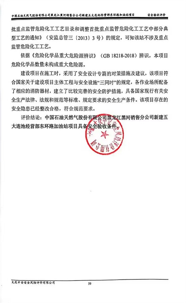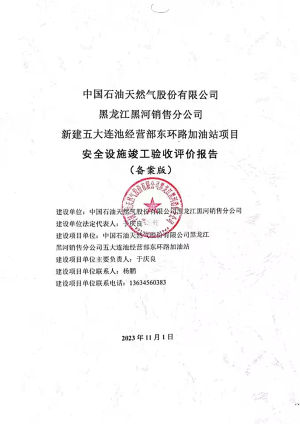 中國(guó)石油天然氣股份有限公司黑龍江黑河銷售分公司新建五大連池經(jīng)營(yíng)部東環(huán)路加油站項(xiàng)目具備安全驗(yàn)收條件。 |