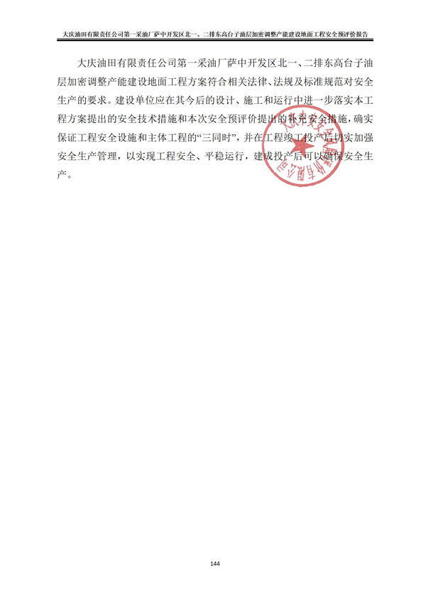 大慶油田有限責(zé)任公司第一采油廠薩中開發(fā)區(qū)北一、二排東高臺(tái)子油層加密調(diào)整產(chǎn)能建設(shè)地面工程方案符合相關(guān)法律、法規(guī)及標(biāo)準(zhǔn)規(guī)范對(duì)安全生產(chǎn)的要求。建設(shè)單位應(yīng)在其今后的設(shè)計(jì)、施工和運(yùn)行中進(jìn)一步落實(shí)本工程方案提出的安全技術(shù)措施和本次安全預(yù)評(píng)價(jià)提出的補(bǔ)充安全措施,確實(shí)保證工程安全設(shè)施和主體工程的“三同時(shí)”,并在工程竣工投產(chǎn)后切實(shí)加強(qiáng)安全生產(chǎn)管理,以實(shí)現(xiàn)工程安全、平穩(wěn)運(yùn)行,建成投產(chǎn)后可以確保安全生產(chǎn)。 |