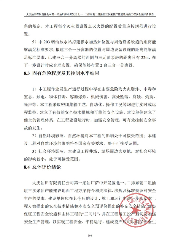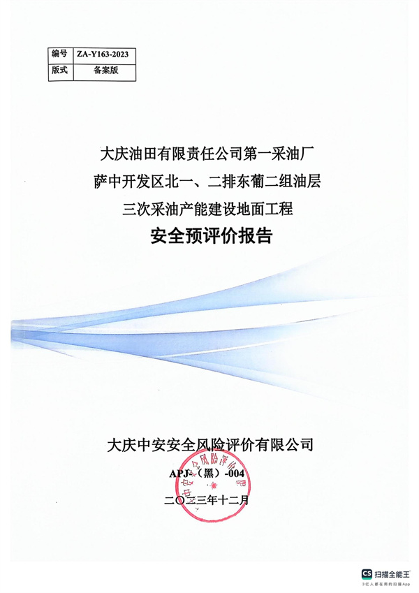 大慶油田有限責任公司第一采油廠薩中開發區北一、二排東葡二組油層三次采油產能建設地面工程安全預評價報告 |