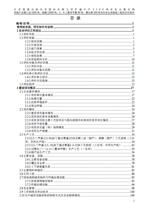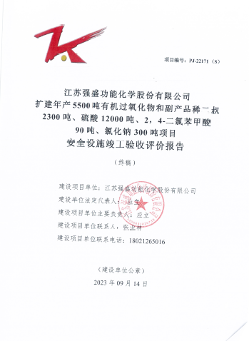 江蘇強盛功能化學(xué)股份有限公司擴建年產(chǎn)5500噸有機過氧化物 和副產(chǎn)品稀二叔2300噸、硫酸12000噸、2,4-二氯苯甲酸90噸、氯化鈉300噸項目安全設(shè)施竣工驗收評價報告