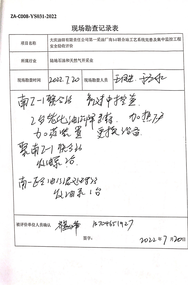 大慶油田有限責(zé)任公司第一采油廠南I-I聯(lián)合站工藝系統(tǒng)完善及集中監(jiān)控工程安全驗(yàn)收評價報告 |