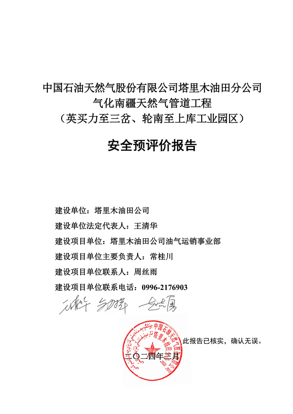 中國石油天然氣股份有限公司塔里木油田分公司氣化南疆天然氣管道工程(英買力至三岔、輪南至上庫工業園區)安全預評價
