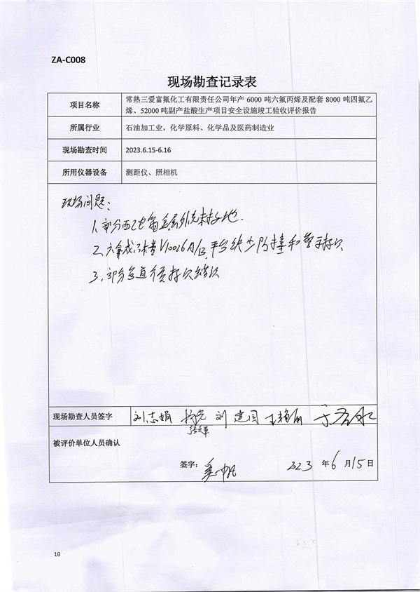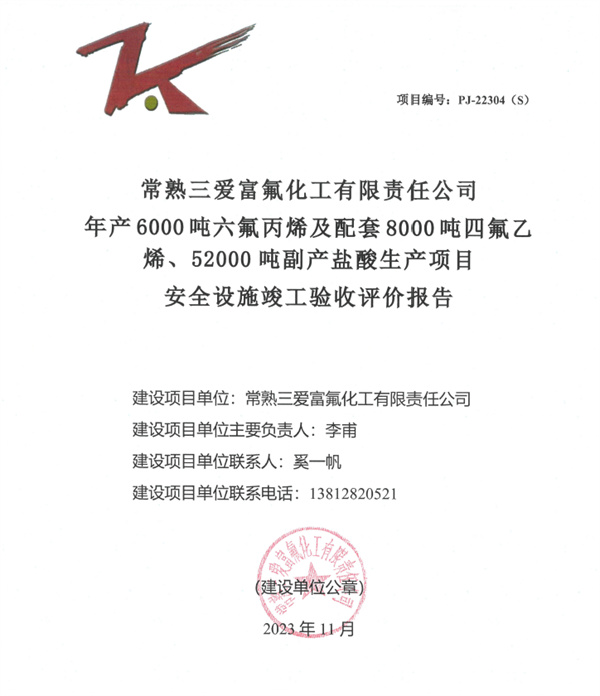 常熟三愛富氟化工有限責(zé)任公司年產(chǎn)6000噸六氟丙烯及配套8000噸四氟乙烯、52000噸副產(chǎn)鹽酸生產(chǎn)項(xiàng)目安全設(shè)施竣工驗(yàn)收評(píng)價(jià)報(bào)告